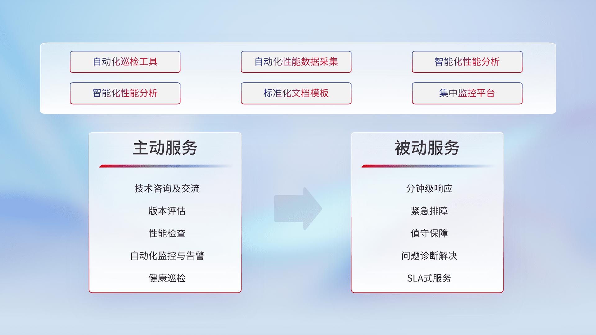 智能化工具和标准化文档,,,,保障服务质量,,,,提供主动服务(包含技术咨询、、版本评估、、、、性能检查、、、自动化监控与告警、、、健康巡检)和被动服务包含(分钟级响应、、紧急排障、、、值守保障、、、、问题诊断解决、、SLA服务)。。。。